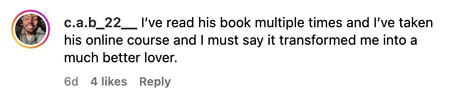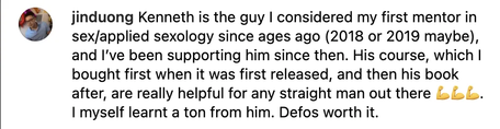 "I bought his book and video course for my husband, and I swear, our sex has NEVER been this good. It was good to begin with, but now FIREWORKS explode every time we hit the sack. My husband has all these delicious new tricks up his sleeve that are making me a VERY happy girl. :D And we have Kenneth and his amazing wisdom, ingenious sex hacks, and accessible teaching style to thank. We are both so grateful and have been recommending his content to everyone we know!"